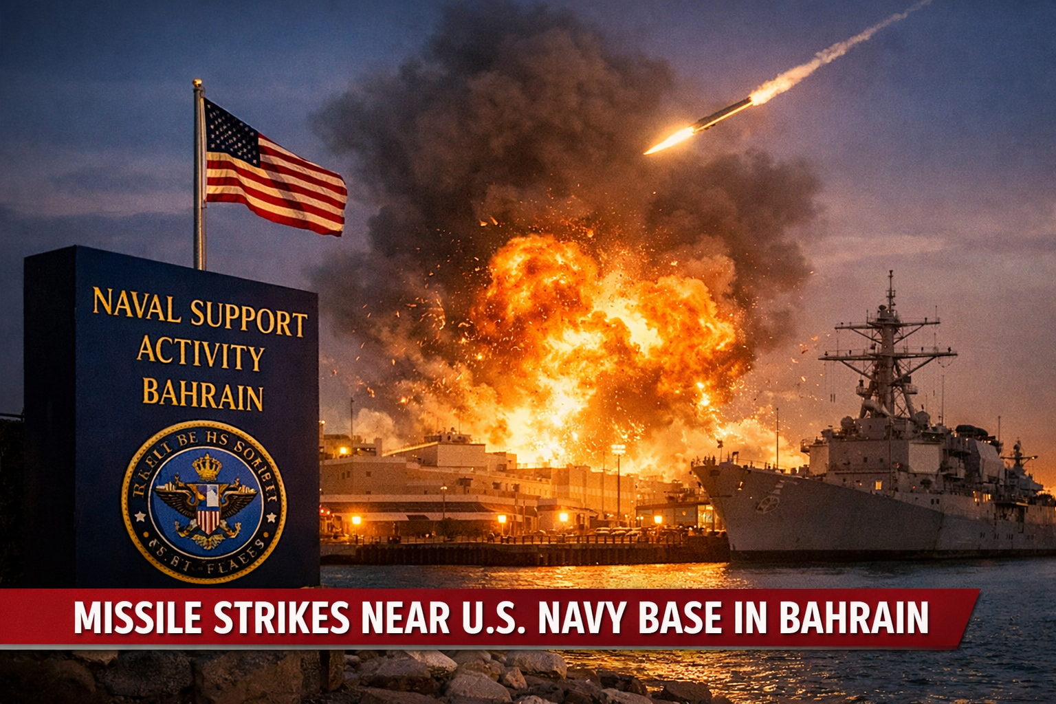 Missile strikes hit areas near the U.S. Navy’s main hub in Bahrain on February 28, 2026, as tensions across the Middle East escalated sharply. Bahrain’s government said a missile struck a service center linked to the headquarters of the U.S. Fifth Fleet, which operates from Naval Support Activity Bahrain in the Juffair area of Manama.